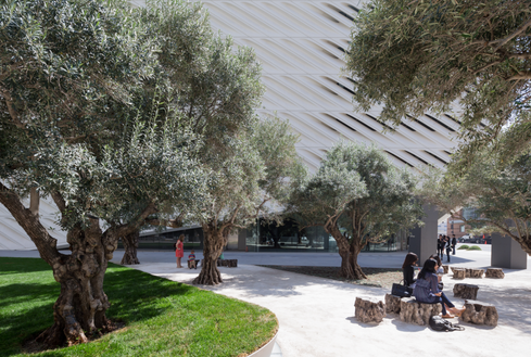 Directly south of the museum is a public plaza also designed by Diller Scofidio + Renfro, in collaboration with Hood Design Studio, Inc. The landscaping features 100-year-old Barouni olive trees and an open lawn, adding another parcel of critical green space to Grand Avenue.