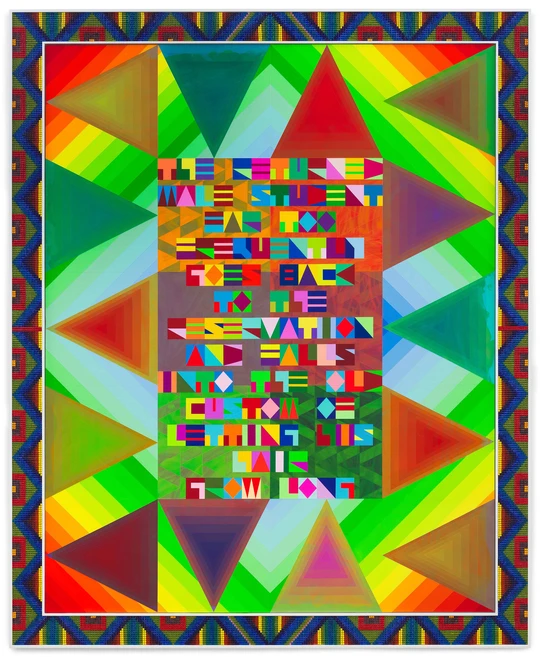 Jeffrey Gibson, THE RETURNED MALE STUDENT FAR TOO FREQUENTLY GOES BACK TO THE RESERVATION AND FALLS INTO THE OLD CUSTOM OF LETTING HIS HAIR GROW LONG, 2024. Acrylic on canvas, glass beads, plastic beads, inset in a custom wood frame. The Broad, Los Angeles. Courtesy of Jeffrey Gibson Studio. Photo by Max Yawney