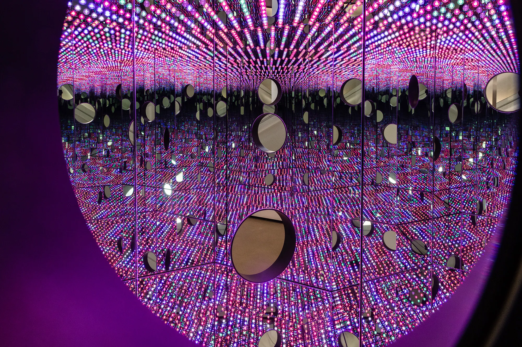 Born and raised in Japan, Yayoi Kusama emerged as an artist during the Vietnam era and continues to make work that reaches diverse audiences worldwide. Throughout her prolific practice spanning over six decades, Kusama has consistently created artwork about repetition and the concept of infinity. In 1965 Kusama produced her first Infinity Mirror Room. This marked a move from the material repetition found in the artist’s paintings and sculptures to the illusion of infinite space using mirrors. Since then, Kusama has made more than twenty unique rooms.