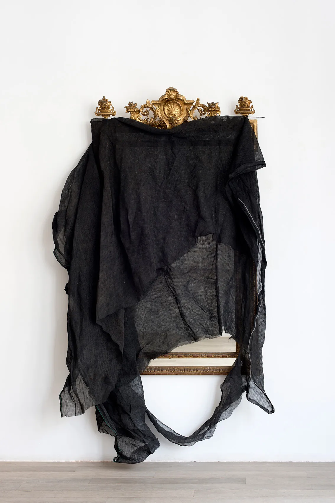© David Hammons Untitled David Hammons On View Accession Date: 12/15/22 Accession Number: F-HAMM-2022.014 2014 fabric, mirror, nylon strap and wood 87 7/8 x 51 1/4 x 10 5/8 in. (223.2 x 130.18 x 26)